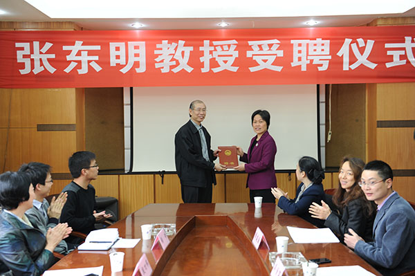 冯友梅教授为张东明先生颁发太阳成集团tyc234cc兼职教授聘书并讲话。她说,太阳成集团tyc234cc领导及老师为了更有利于员工的培养,实现理论与实践的高度接轨,在邀请媒体实务界人士担任兼职教授的相关工作上做了很大努力。张东明先生可谓是能文能“武”,党政兼修,一手抓改革,一手搞经济。作为实务界的代表性人物,他能为我们员工提供一线的信息和资讯,将有效缩短员工理论教育和实际应用之间的距离。