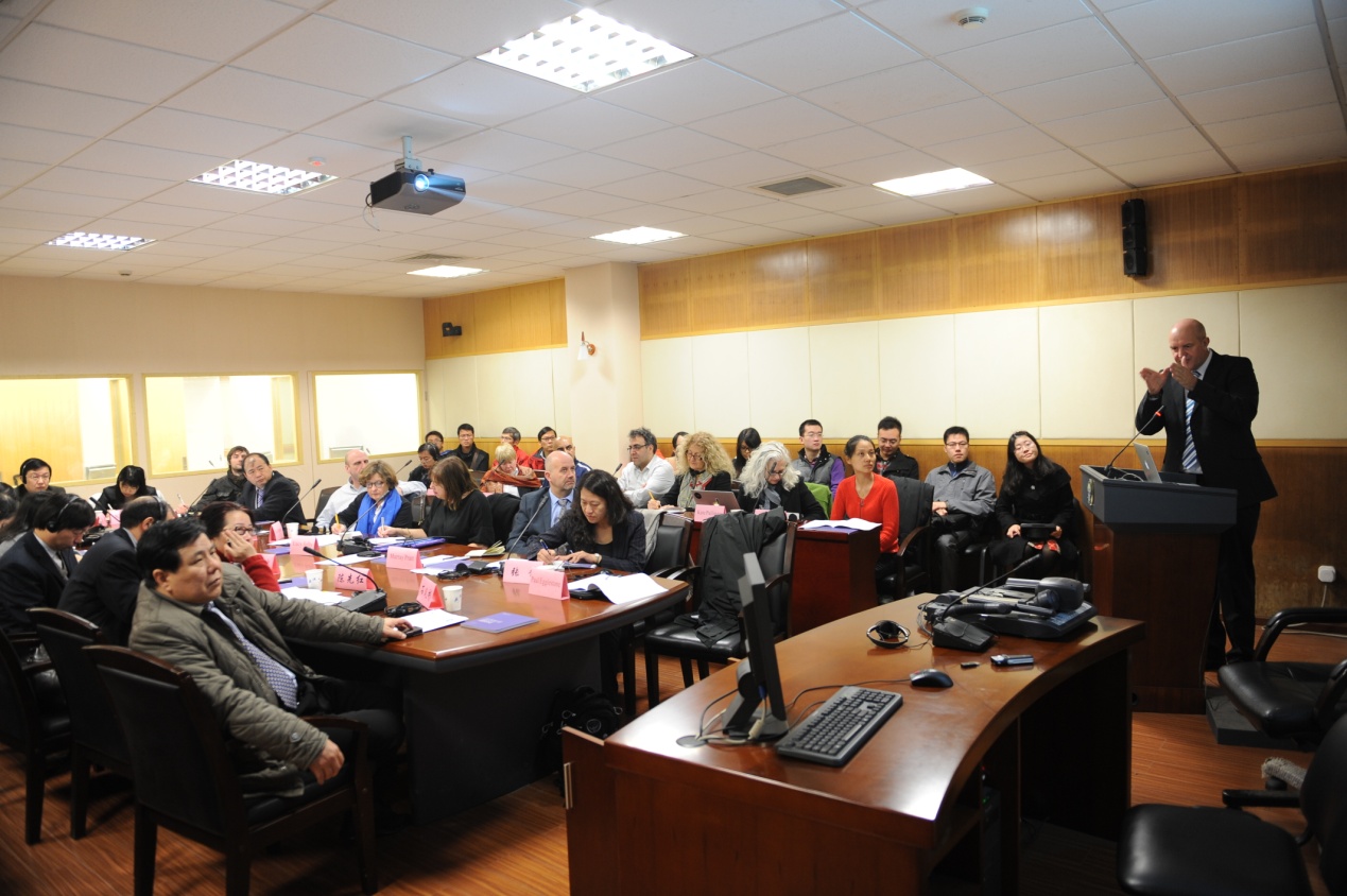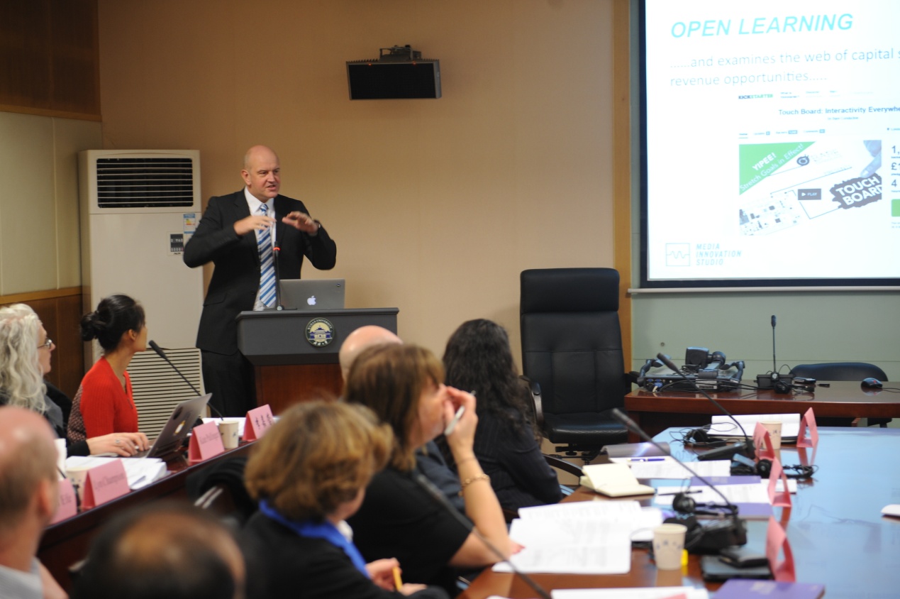 英国大使馆文化教育处高等教育总监张静女士,公司石义彬经理,相继发表了开幕式致辞。石经理对各位国外专家同行的到访表示诚挚的欢迎,并希望在媒体技术高速更新、媒体环境发生变革的时代里,专家学者们能够就新媒体及新闻教育事业的发展前景、发展方向提出真知灼见。本次论坛的主题为“新媒体时代高等教育所面临的机遇与挑战”。英国中央兰开夏大学媒体创新工作室总监Paul Egglestone发表了题为“开放式学习——向员工介绍全新领域知识及其获取途径”的演讲。