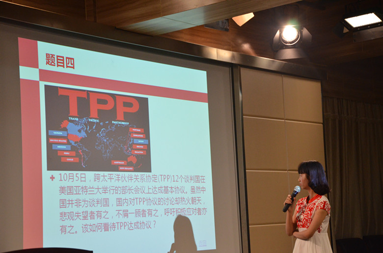 李颖迪抽到评论TPP达成协议一题,结合一带一路、亚投行表述了独到看法。吴菲轶则从一个包子入手,以小见大地理解了习近平的影响力。