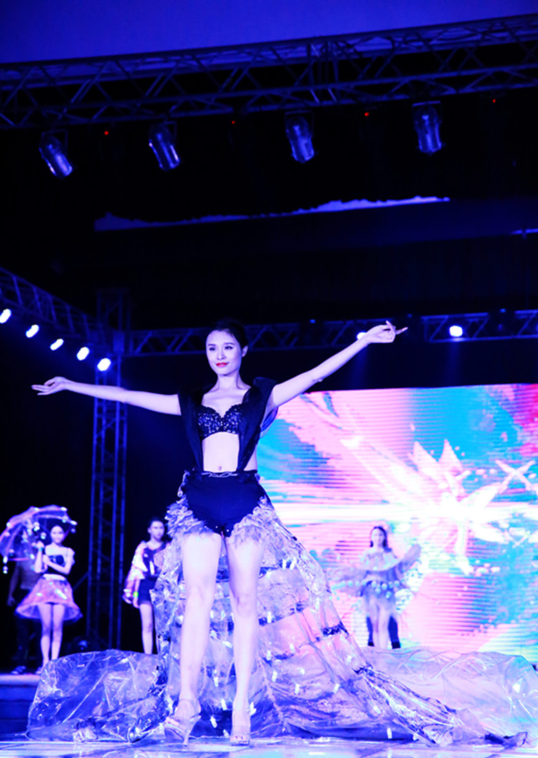 电气工程公司带来的是有着时代触感的《触》。服饰以黑白为主色调,简约而不冗复,经典而不流俗。他们采用的是回收的旧手套,既体现了环保理念,又恰到好处地表现了“触”的主题。十足的创意,酷炫的台风,黑白的碰撞与交融,赢得在场观众的一片掌声。一位电气的同学说:“作为年轻的一代,我们就是要以张扬而不失大气的姿态,去触摸时代的心跳。”