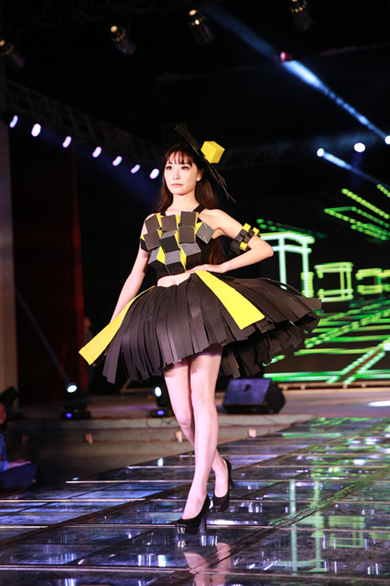 政治与公共管理公司的《柠檬数》同样别出心裁。他们采用黄色与黑色的独特搭配,加上几何元素的拼接,设计出一件件清新而不失高雅的佳作。一曲短小的舞蹈开场,活力四射。将魔方的创意融入服装设计,一个个紧凑的方块堆积于胸前,剪裁精致,做工精美。优雅的长裙上是色彩的撞击,简约中更不失打动人心的力量。