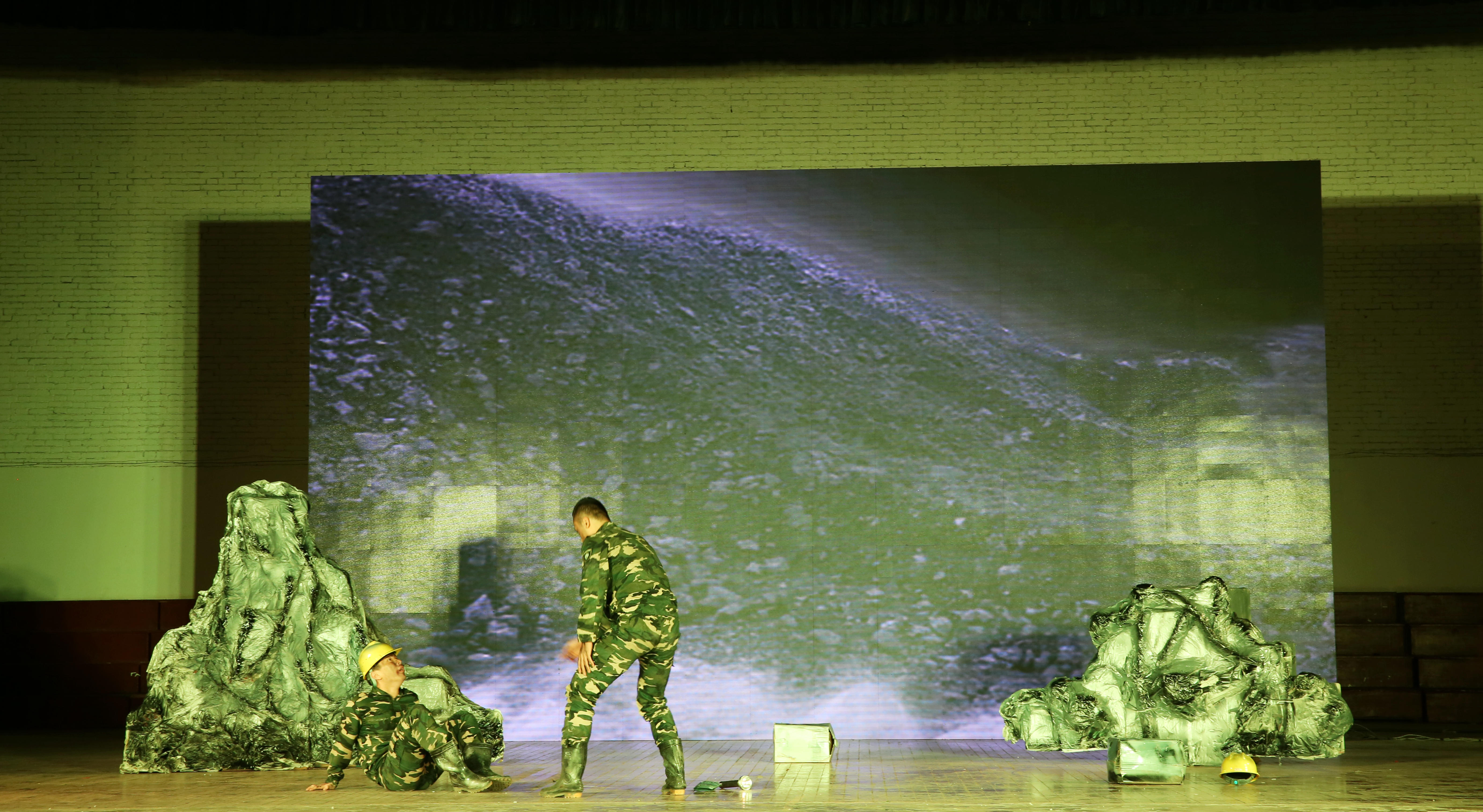 在暗道中听见大山呼吸的声音去年缺席金秋情景剧的艺术学系重返舞台,这次,他们选择以两个人,以大胆独特的方言的形式,讲述了一个关于工程兵的故事。他是班长,他是列兵,他们共同被困暗道。班长的老练沉稳,列兵的胆小怯懦,在暗道的对话中表现得淋漓尽致。暗道坍塌的晃动,却被班长说成“大山呼吸的声音”。当列兵说自己后悔当工程兵的时候,班长愤怒地把他一把推倒在地,回忆起那些为暗道留下鲜血和为祖国建设甘于牺牲的峥嵘岁月。在暗道即将坍塌的时候,他又一次选择护住列兵,自己却被石头深埋......这是来自大山深处的声音,沉稳,而又有力。
