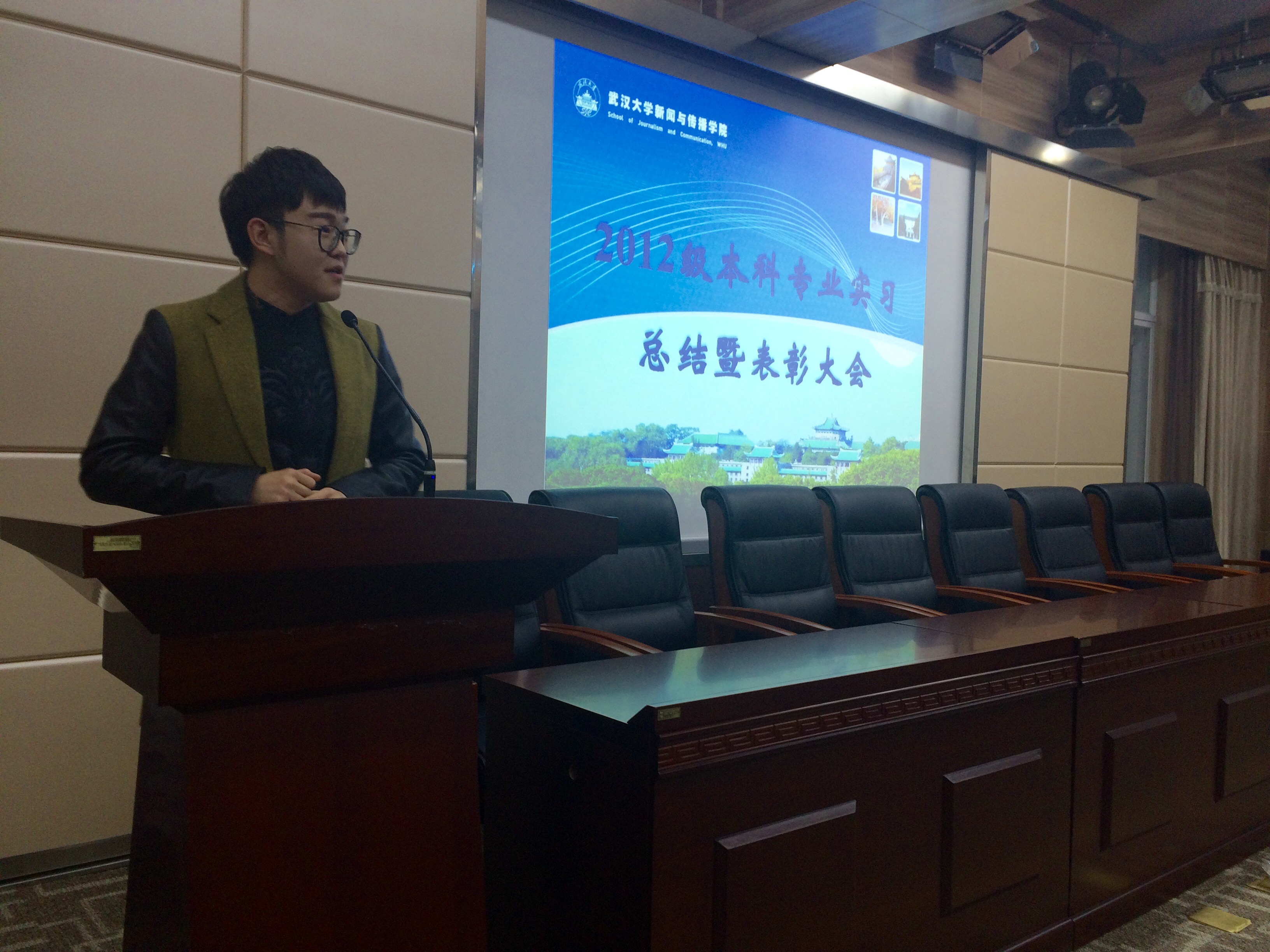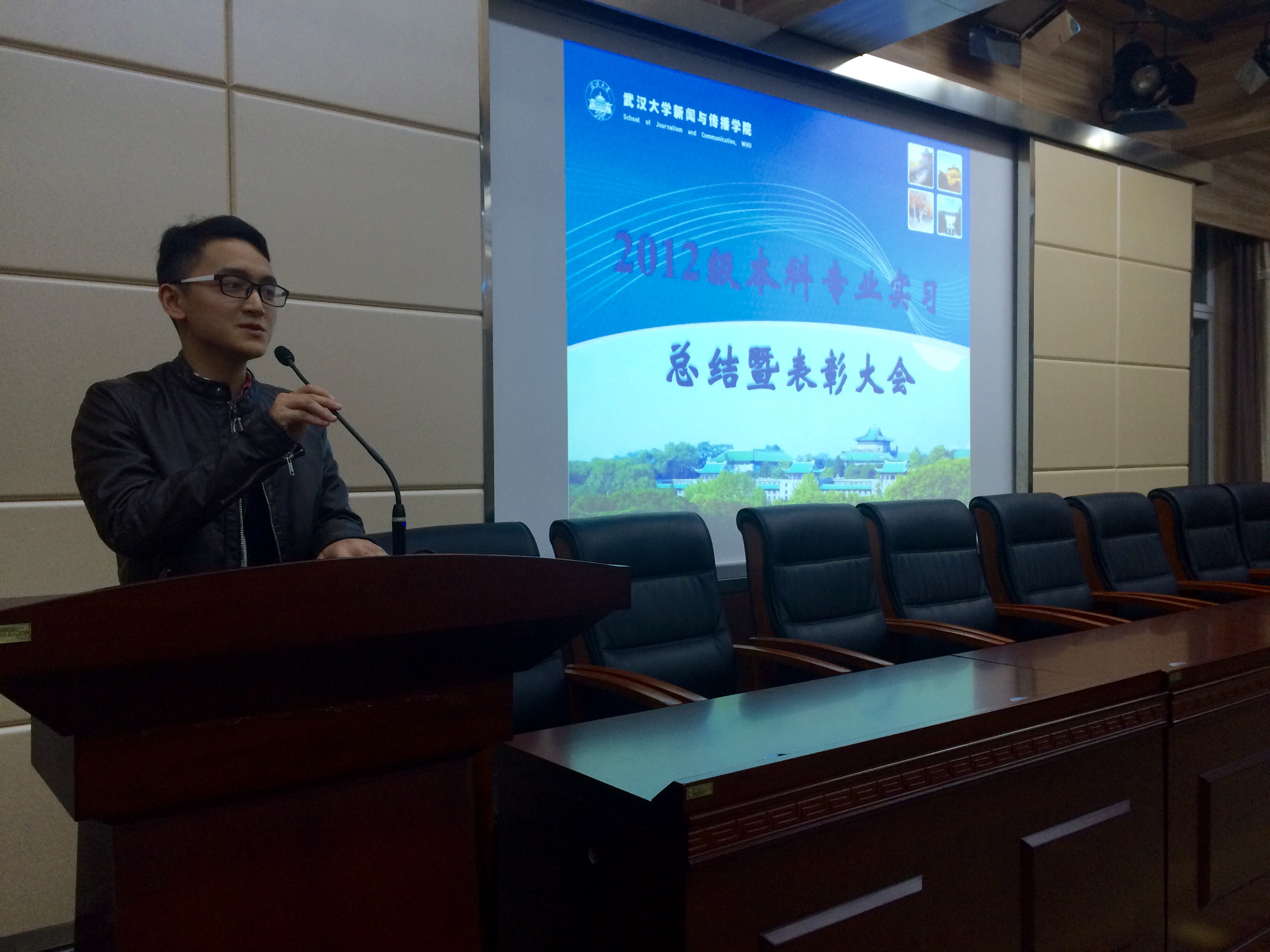 之后,12级新闻班胡鑫、播音班何恩泽、播音班鲁念、广设班李梦芊、网传班罗洪锐、广电班张佳宁、广告班李艳、新闻班邹昕宇分别上台做实习经验的分享。