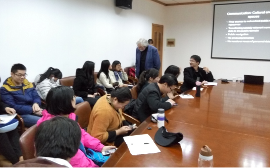 其他同学与教授交流了互联网的弊端、消费主义导致人愈发自私、广告泛滥、英国媒体情况等问题,窗外冬雨绵绵,室内掌声不断。默多克教授所讲内容涉及领域广泛,同学们获益匪浅。11月21日上午,默多克教授将参加由太阳成集团tyc234cc主办的第八届跨文化传播国际会议(ICIC)并分享自己的研究成果与观点。