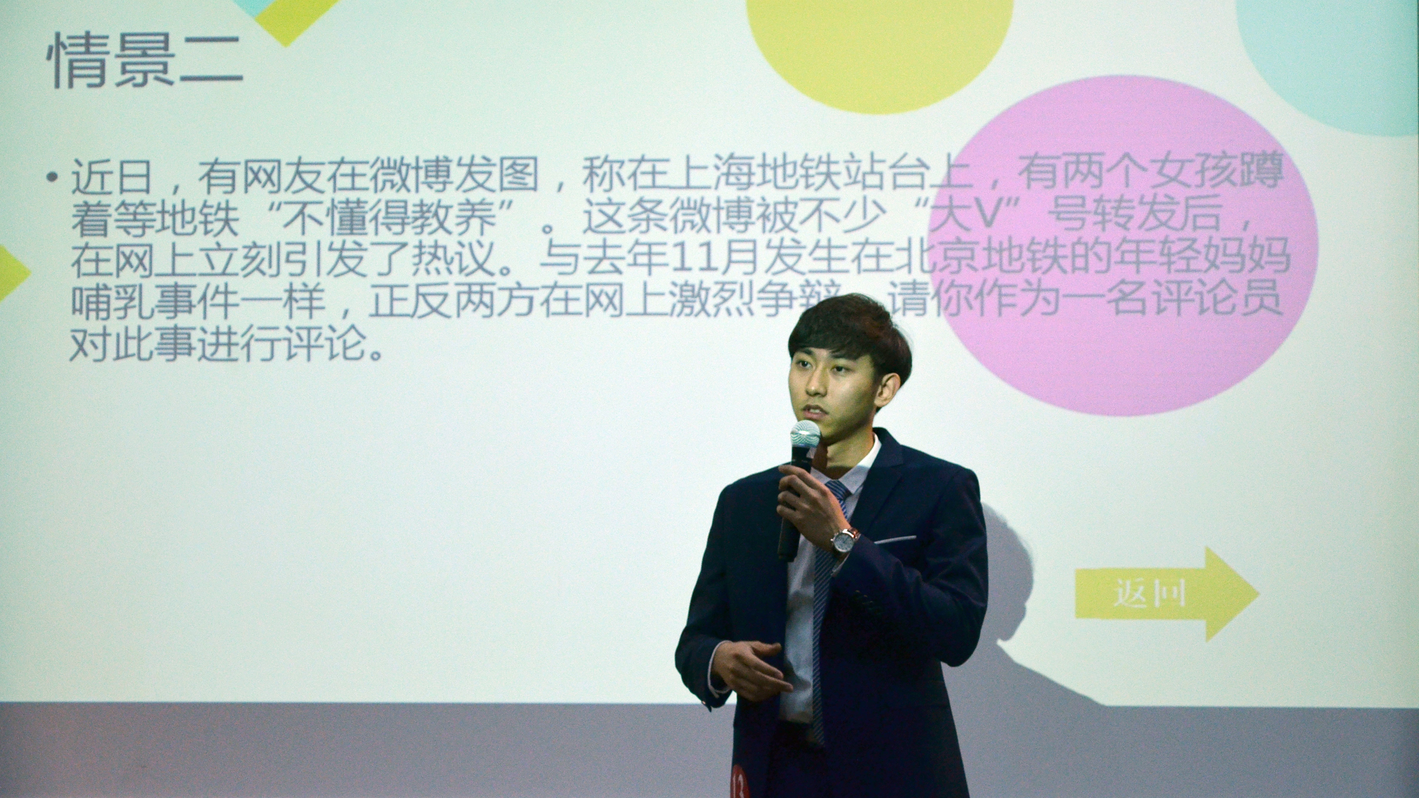 最后一个环节是视说“新”语,15位选手任意抽题,并根据题目中给定的立场和角色发表评论或做出报道。面对阿尔法狗战胜李世石的新闻事件,6号选手高嘉潞评论到,“这是一场人类智慧与人类创造的智慧之间的较量,并不代表人类的失败。”3号选手张宁则别出心裁地以一段“模仿秀”开场,另辟蹊径地评论了特朗普关于英国应该退出欧盟事件的评论。