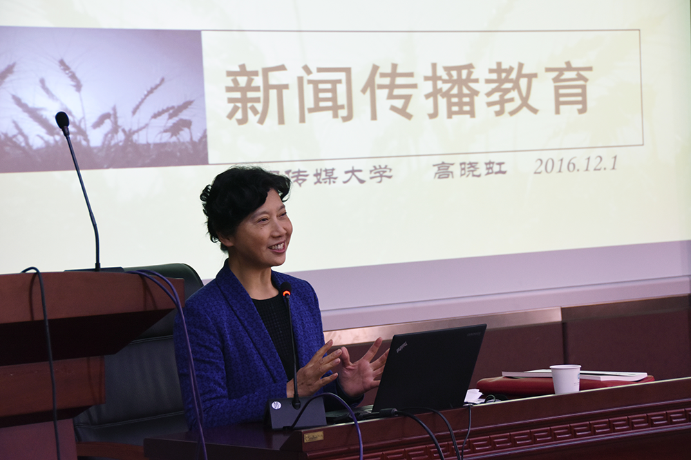 高教授以中国传媒大学组织教师集体学习无人机拍摄技术和《京华时报》转型失败并将于2017年休刊的案例引出了当天演讲的主题“新媒体语境下的新闻传播教育”;指出:我们要积极拥抱新媒体、真正理解新媒体、深刻融入新媒体,当前的新闻传播教育也要跟上这股浪潮,坚持正能量,培养适应时代发展的人才。高晓虹认为新媒体以“视听结合”为核心样态,以“移动互联”为主要传播特点,或许某一天报社、电台、电视台会逐渐消亡,但视听传播永恒,新闻与传播专业永远有其存在的价值。新闻传播永恒,是否就意味着媒体高枕无忧了呢?高教授接下来表达了她对当前主流媒体生存和发展状况的顾虑。首先,主流媒体接入新媒体技术更多的是迎合上级要求、空有其表,并没有实实在在希望做大做强,考量真实传播效果;其次,主流媒体并没有充分发挥国家所赋予并经过数十年实践积累的强大影响力,不能充分调动资源在新媒体时代重塑话语、发挥应尽职责;最后,在传播内容和传播渠道的关系上,主流媒体应该重视渠道建设,“有大胸怀、大格局、大视野,才能干大事”。