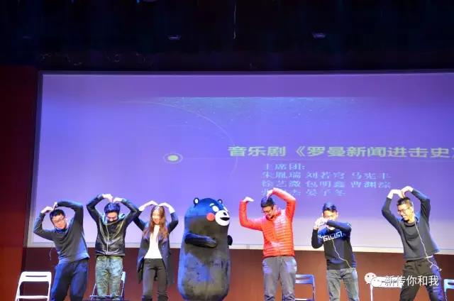 最后的压轴节目,是由新一届主席团集体献上的音乐剧《罗曼新闻进击史》,“QQ”刘若穹摇身变为熊本熊,晏子冬弹唱自创歌曲,主席团演绎新闻院员工生活,真可谓“新”火燎“元”。最后,六位男神主持上台致辞,献上祝福,晚会圆满结束。