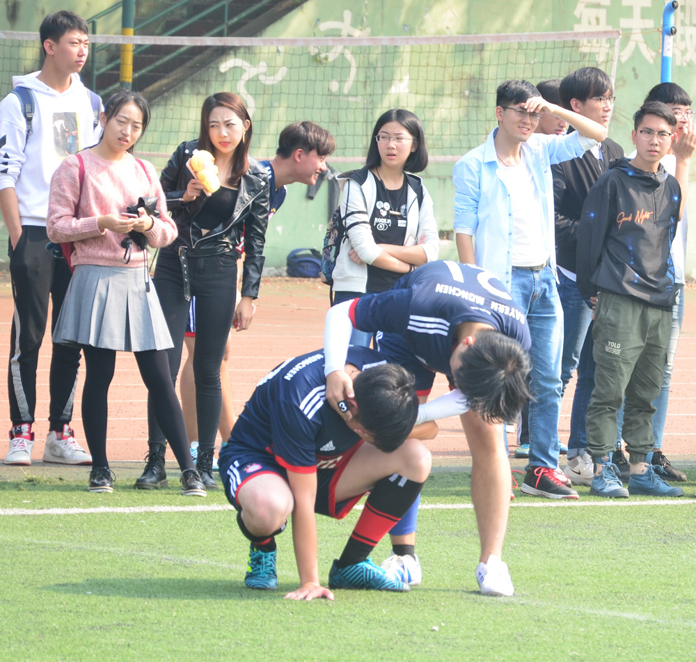 此役双方均派出最强阵容,可见双方都期待能将冠军奖杯收入囊中。尽管正值炎热的中午,周边也还是有很多同学一边擂鼓,一边为自己的队伍呐喊助威,场面十分热闹。