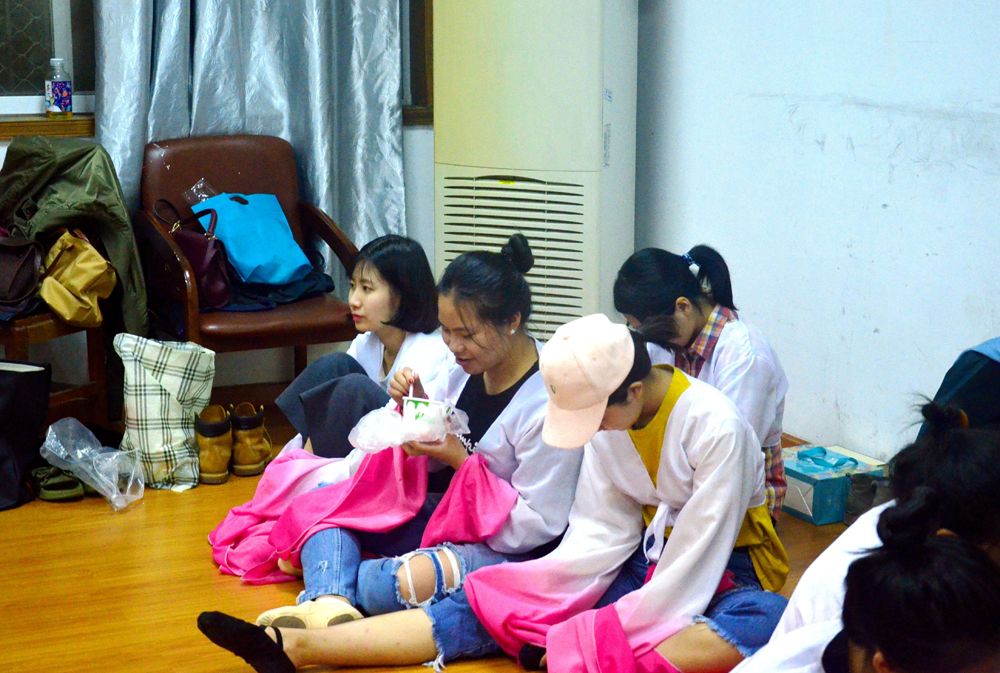 2017年11月11日晚上,天气阴冷,阵阵冷风吹过,空中还落下毛毛细雨。马上就要上场了,换好衣服不久的新闻院舞蹈演员们步履匆匆,急忙从院办赶到梅操。第二十一个舞蹈表演完毕,心情忐忑的18位姑娘立刻跑上舞台,找到自己的位置,摆好姿势,露出笑容,静静等待着音乐响起的那一刻。