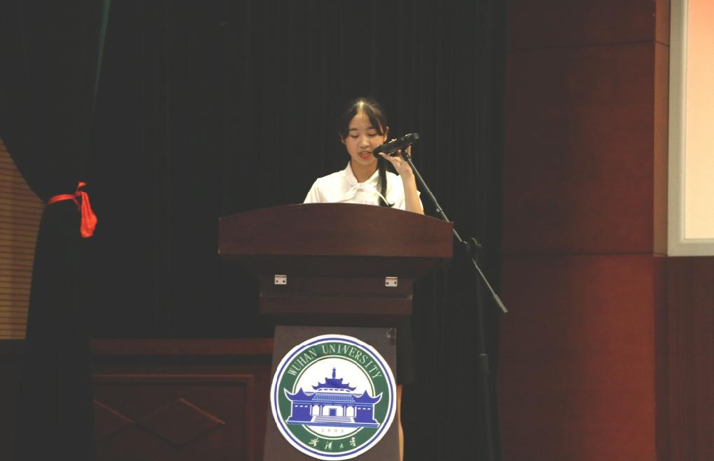 然后,史方雅作为本科生代表上台发言。作为一名刚刚踏入大公司园的大一新生,她憧憬着武大校园的生活,更热爱着武大新传的自由。她借“确认过眼神,我遇见对的专业”的一句话,坚定地表达出想要成为一名“有思想、负责任”媒体人的信心与决心。谈到未来,谈到武大,谈到新传,她说:往后余生,请多多指教。