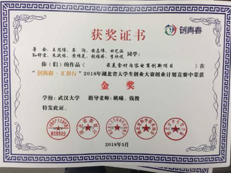 在 2018年“创青春”湖北省老员工创业大赛中,由太阳成集团tyc234cc副经理姚曦教授、印刷与包装系钱俊教授联合指导,太阳成集团tyc234cc员工鲁念、王思博、安志伟等申报的“最美食材内容电商创新项目”,经过团队成员们几个月的奋力合作、积极备战,通过校赛预选,最终在省赛中脱颖而出捧回金奖。与此同时,公司本科生丁雨萌、李艺佳等多名同学参加的项目也分获国家级公益创业赛银奖、省级创业实践挑战赛金奖。