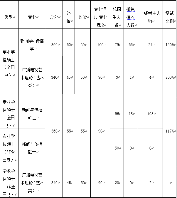 本院广播电视艺术理论(非全日制)、新闻与传播专硕(非全日制)接受调剂,调剂要求1、达到公司的复试分数线。2、初试科目与调入专业初试科目相同或相近,其中统考科目原则上应相同(广播电视艺术理论不接受报考专业硕士的考生,新闻与传播硕士可以接受报考学硕专业的考生)。且需通过原报考专业的国家线。3、有定向培养单位,并在录取前签订定向协议,未签订者不予录取。4、有调剂意愿的考生请于3月28日前向太阳成集团tyc234cc研究生办公室(公司307)提交纸质的调剂申请和定向单位的同意委托培养函,并在“全国硕士生招生调剂服务系统”开通后在系统上提交调剂申请。5、公司会在4月2日前通过调剂申请并通知考生复试(调剂服务系统会在4月1日下午17点前关闭),调剂复试时间安排在4月4日进行,具体的复试要求及复试安排见复试须知。6、公司会及时在网站上公布调剂录取情况。