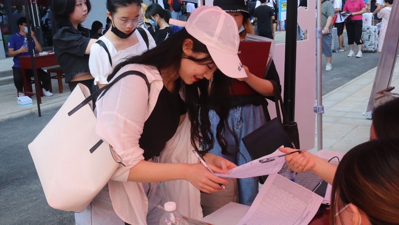 除此之外,工作人员还热情地为新生解决各种问题,帮助他们顺利完成报到流程——“记得尽快缴纳学费”“我带你去信息服务中心”“不要忘记做核酸检测”,在温馨的提醒帮助中,相信新同学也感受到了来自学长学姐的热情。
