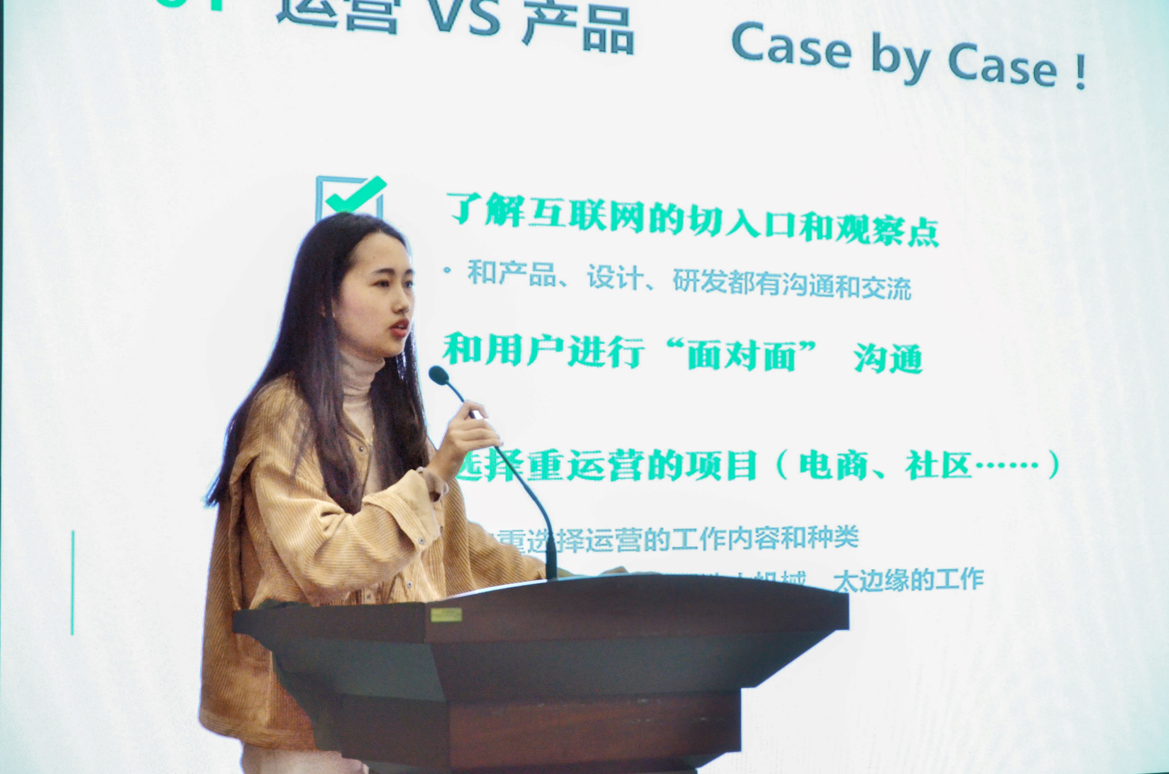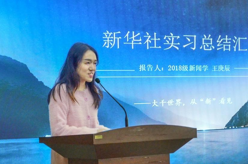 随后,五位优秀实习生代表依次上台向大家汇报她们的实习情况。首先是来自新闻学专业的王庚辰学姐,她向我们分享了她在新华社新媒体中心的实习经历,在她看来,这是一段既“飞入太空”又“深入小巷”的旅程。同时她也向我们分享了许多实习小经验,分为工作态度篇、专业技能篇和待人处事篇三个部分进行讲述。