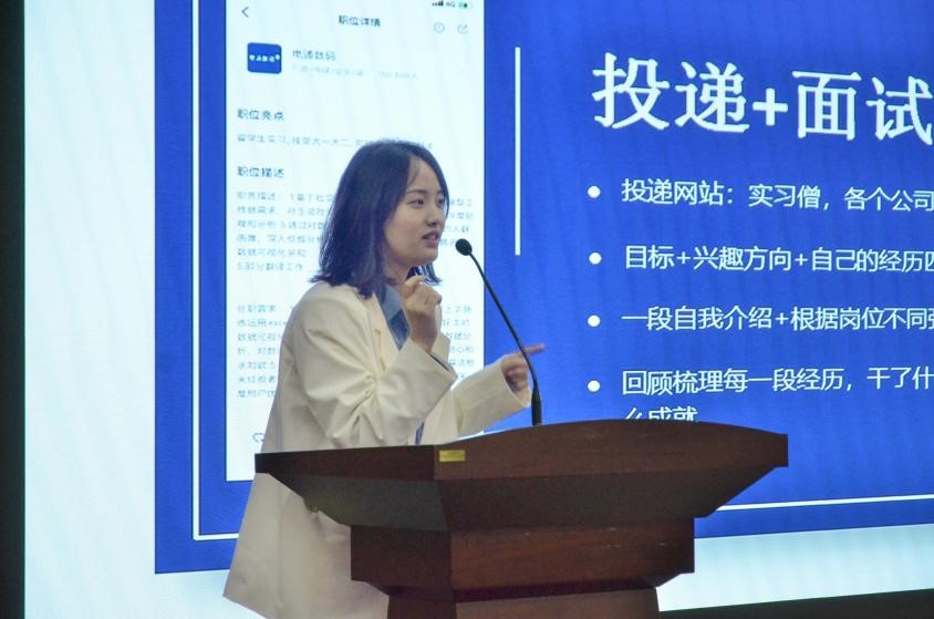 来自广告学专业的潘颖学姐介绍了她在电通投资公司的实习经历。学姐首先向我们指出在简历制作、简历投递以及面试中需注意的问题,接着又分享了许多实用经验。