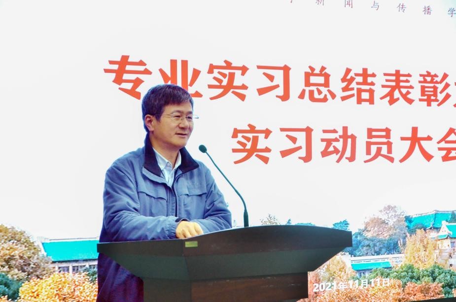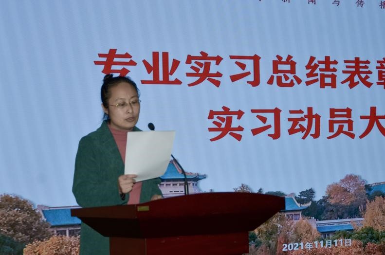 大会的第一项内容是由徐同谦老师向大家介绍2018级本科生的实习概况。徐老师首先介绍了实习地域分布情况,指出在北京、武汉实习的人数较为集中;接着介绍了实习单位分布情况,指出媒体和互联网单位是较为热门的选择;最后,徐老师向大家介绍了专业实习的特点和不足。