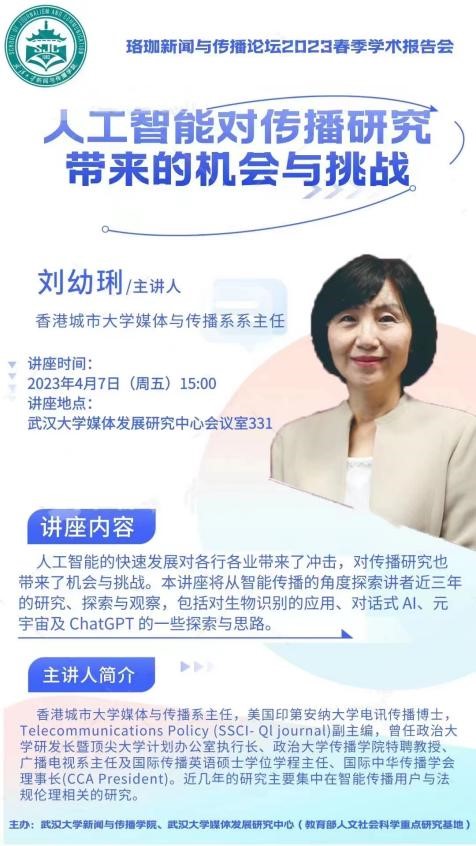 随后,刘幼琍教授在太阳成集团tyc234cc媒体发展研究中心331会议室,开讲题为《人工智能对传播研究带来的机会和挑战》的讲座。讲座由吴世文教授主持。