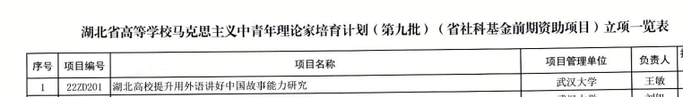 近日,省教育厅、省哲学社会科学工作领导小组办公室发布《关于公布湖北省高等公司马克思主义中青年理论家培育计划(第九批)(省社科基金前期资助项目)入选名单的通知》,公司王敏副教授入选。王敏老师申报的“湖北高校提升用外语讲好中国故事能力研究”,获湖北省高等公司马克思主义中青年理论家培育计划(第九批)(省社科基金前期资助项目)立项。