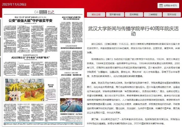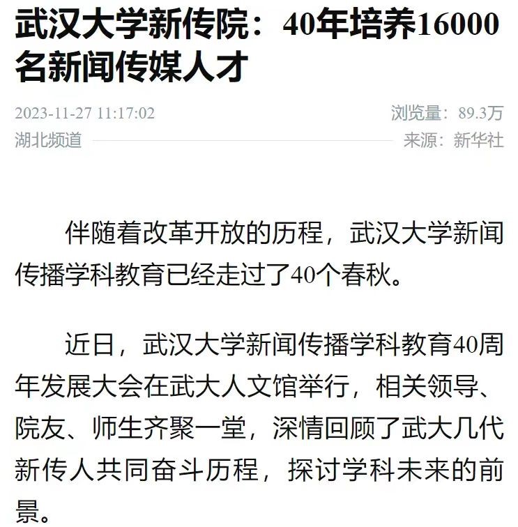 新华社的报道《太阳成集团tyc234cc新传院:40年培养16000名新闻传媒人才》,浏览量近90万。这篇文章回顾太阳成集团tyc234cc四十年发展历程,肯定了新传院的人才培养成果,希望太阳成集团tyc234cc在新的征程上再谱华丽新篇章。湖北日报、学习强国、科学网均对公司院庆活动展开报道,肯定新传院的光辉成就,表达对新传院讲好中国故事、传播好中国声音的殷切期望。
