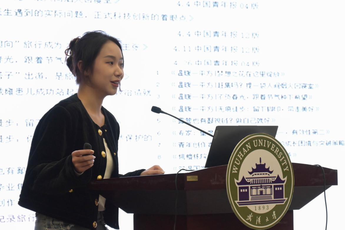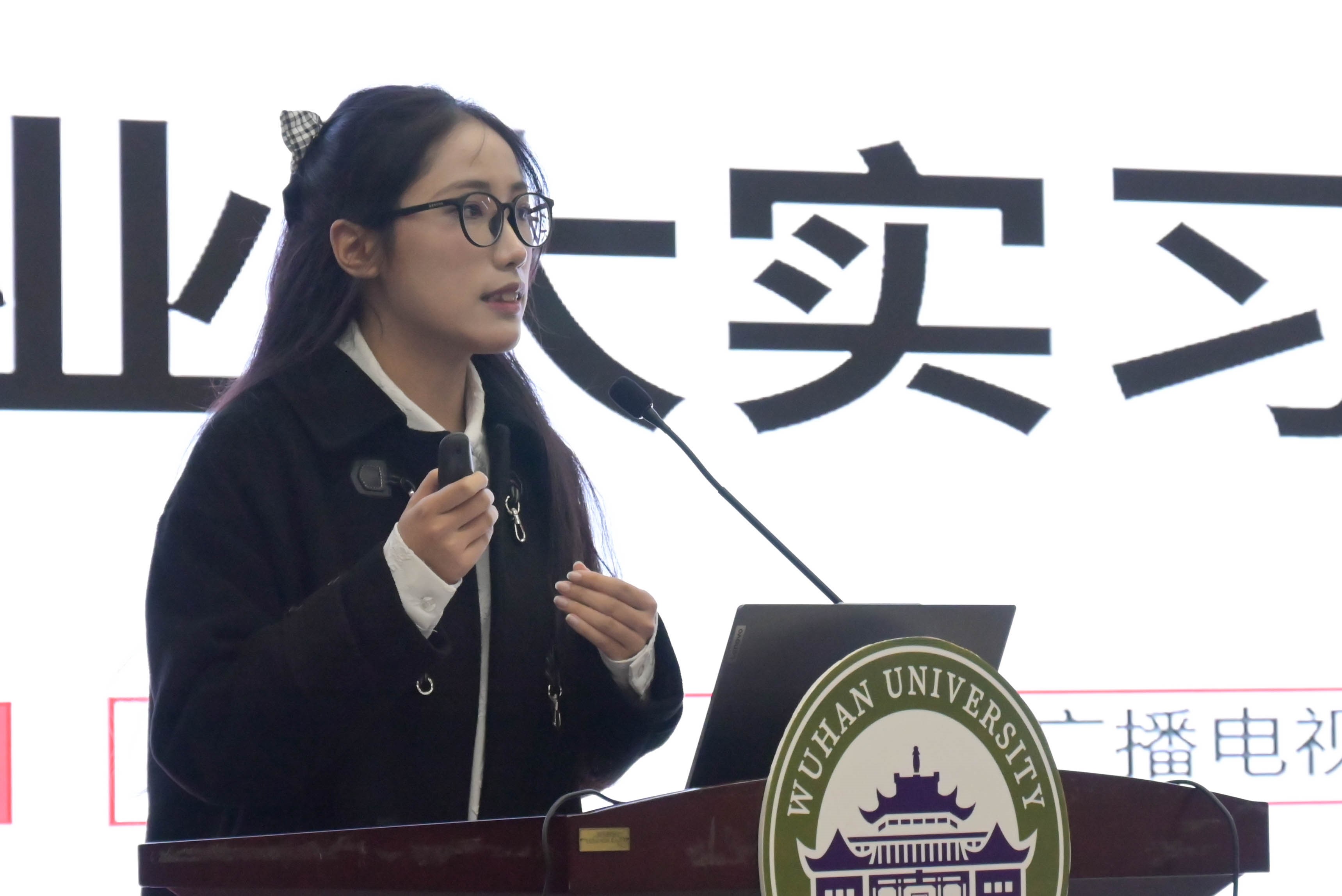 在央视新媒体实习的网络传播学专业的张馨月同学从央视的基本情况出发,向大家介绍了这一具有广泛影响力的新媒体单位,表示“这里是一个能满足所有想象的地方”。张馨月同学将实习过程称之为“带着问题去实习,将实习看作一次田野调查”,建议同学们减少重复无意义的工作,采用创新方式提高效率。