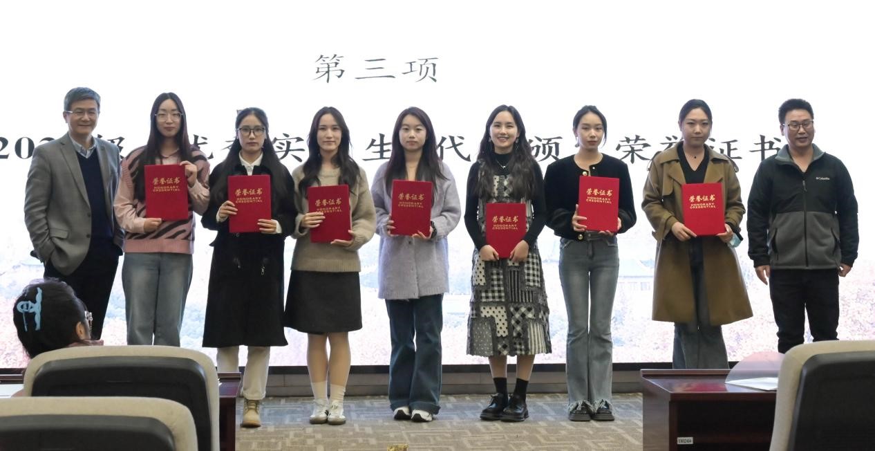 大会第二项,林婕老师宣读公司表彰决定,授予侯婧怡等65名2020级本科生“优秀实习生”称号,并由洪杰文老师和徐同谦老师为到场的优秀实习生代表颁发荣誉证书。