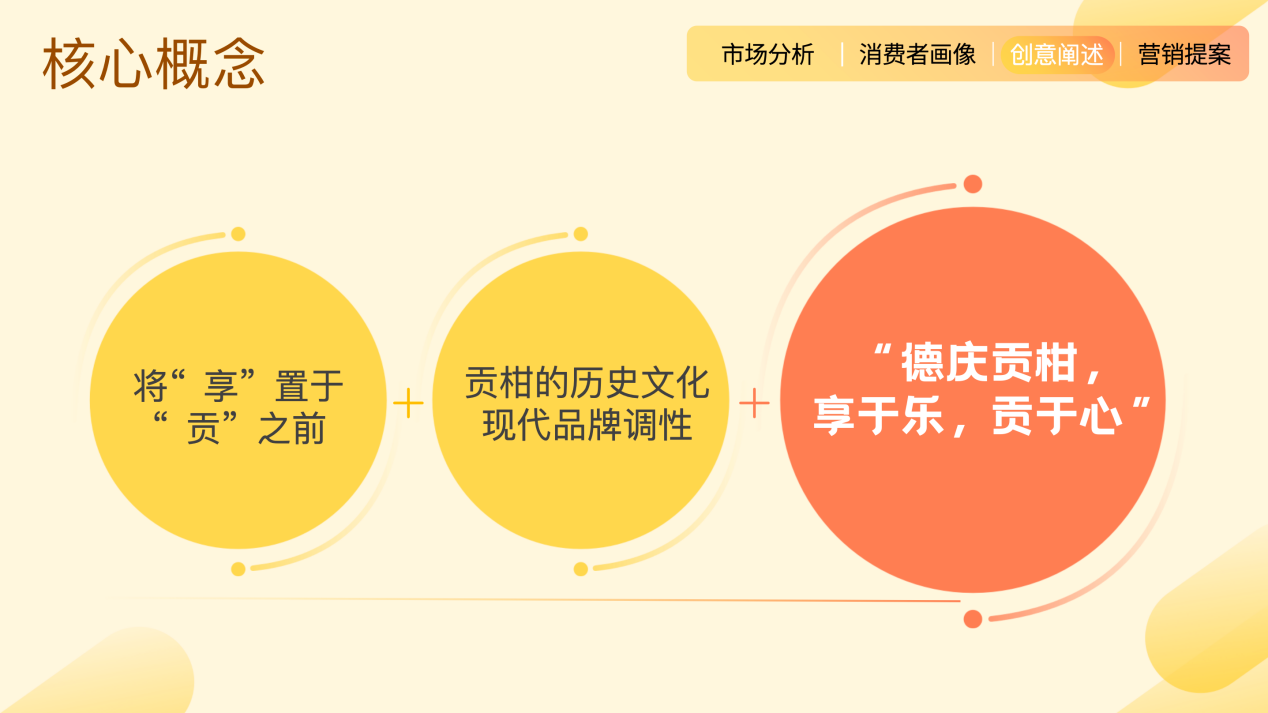 主打历史和口感的广告语“德庆贡柑、传承千年,中国柑王、品味甘甜”,主打独特生长环境孕育好产品的广告语“北纬23°的清甜”,一语双关的广告语“柑为天下鲜”,强调爱与温暖的广告语“心柑情愿”,强调产品和文旅共同开发的广告词“享于乐,贡于心”,活力无限的青年学子创意也无限,为“德庆贡柑”策划了一个个让人爱不释手的营销方案,设计了一个个回味不尽的推广概念。“瞬息之间”团队以“享于乐,贡于心”为主创意摘得“最佳提案奖”。 “这个创意来自背后数十条分析结果的支撑。因为‘贡’的意义被刻意强调,我们希望打破这一限制,重新认识贡柑的产品定位,同时让‘贡’字元素与现代品牌调性结合,让消费者知道,德庆贡柑是不用多想就能‘享’受到的高品质水果。”团队这样解读他们的提案。