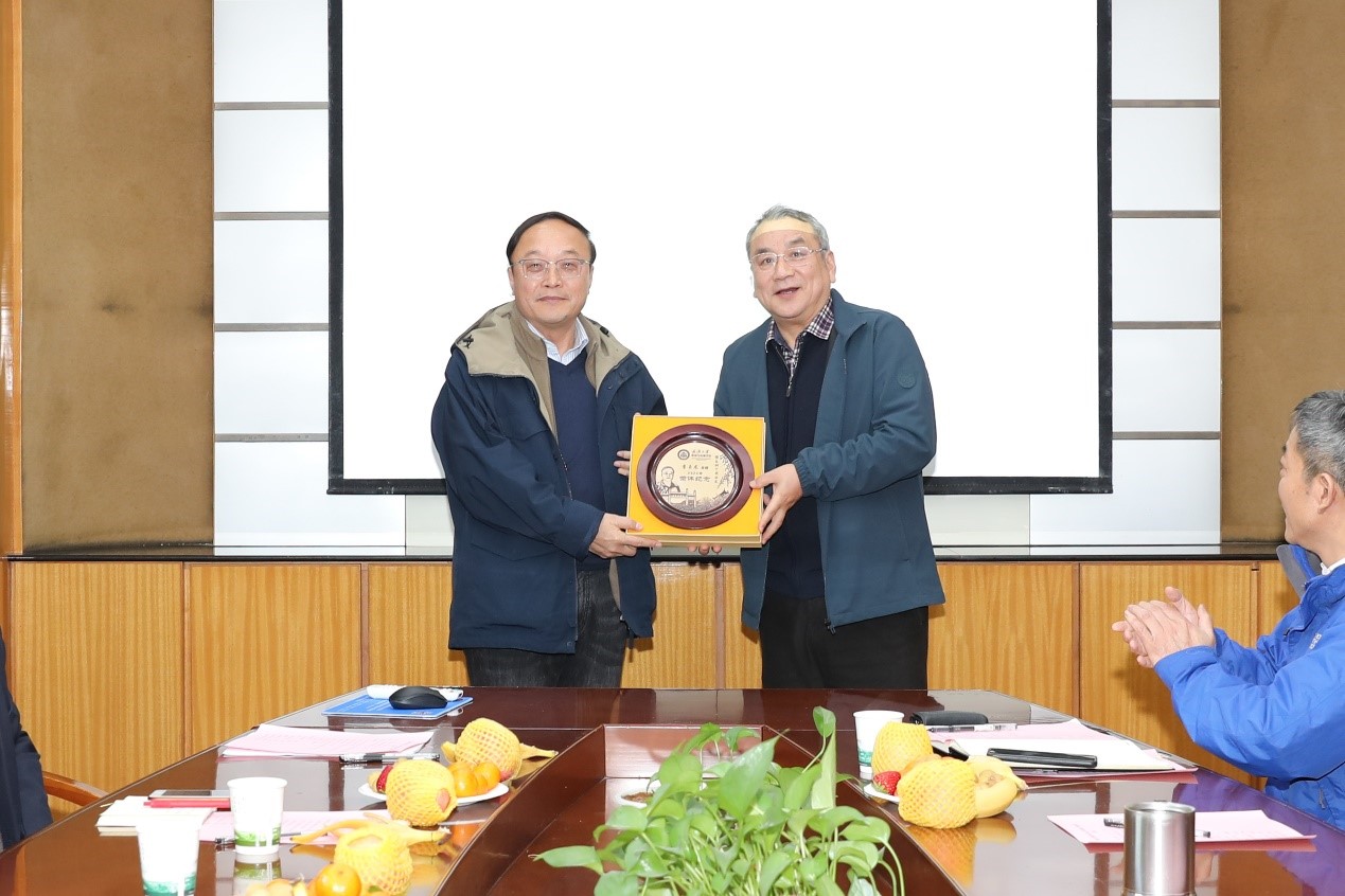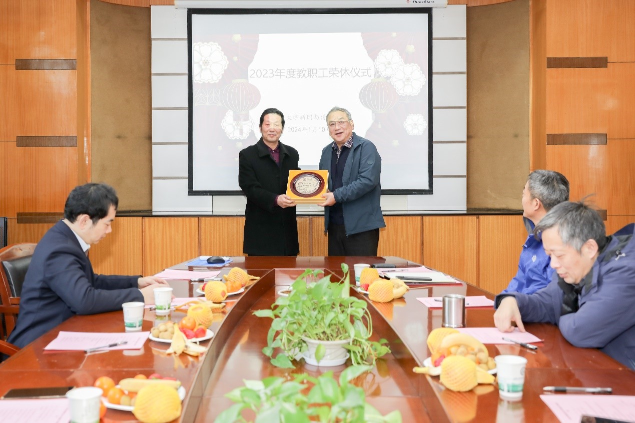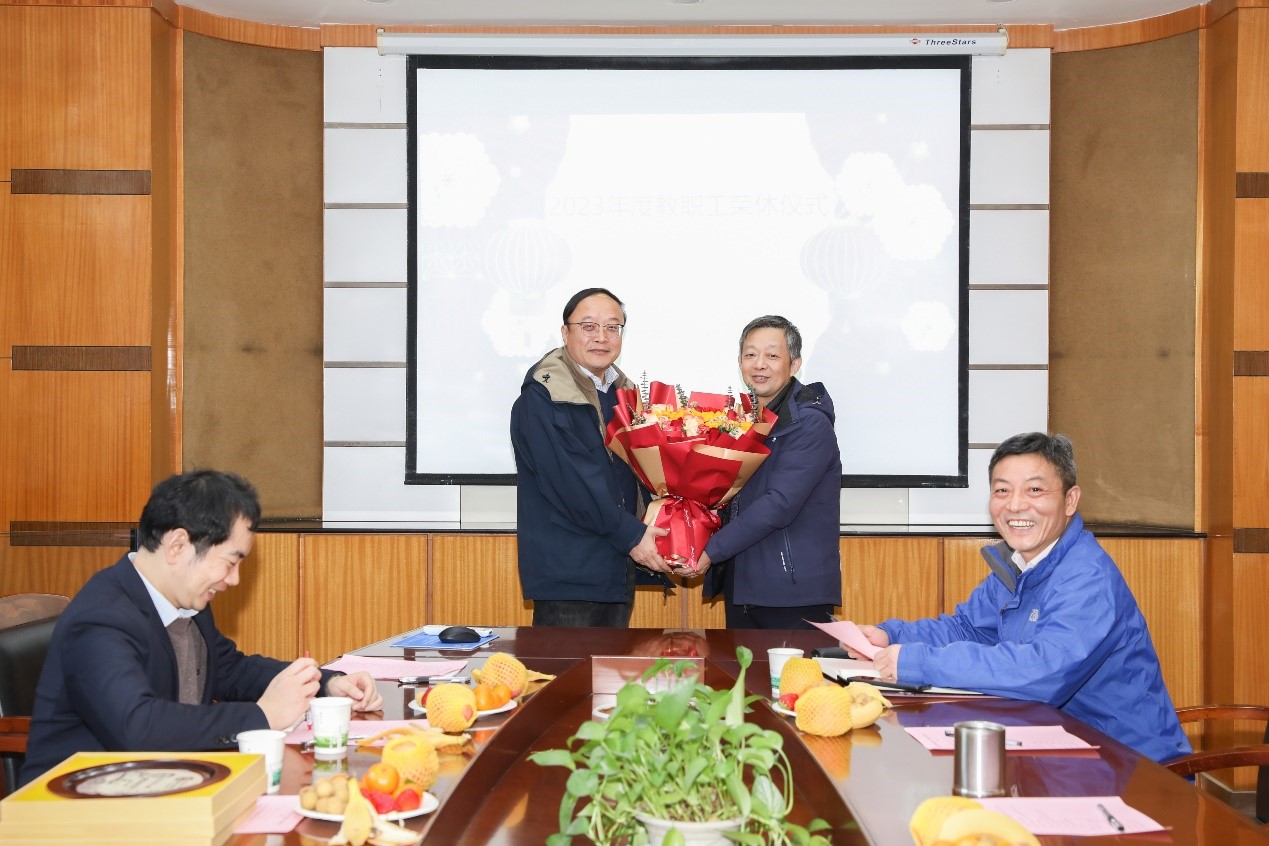 2023年,公司的周光明教授和公司原党委书记李玉龙荣休。公司经理强月新教授首先为这两位荣休的教职工颁发公司特制的荣休纪念盘。