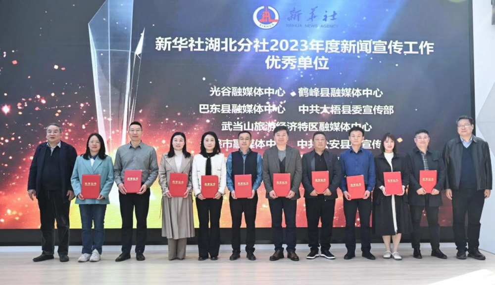 在表彰“新华社湖北分社2023年度新闻宣传工作”优秀单位、优秀通讯员仪式环节,新华社湖北分社分党组成员、常务副总编李鹏翔邀请强月新共同为获奖单位颁奖。