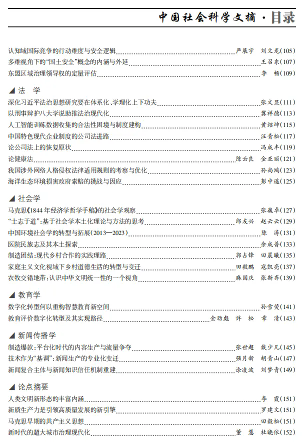 《中国社会科学文摘》由中国社会科公司主办,与《新华文摘》和《高等公司文科学术文摘》并称为“三大文摘”,是人文社会科学领域影响最大的文摘期刊。