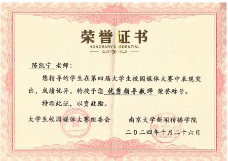 2024年10月26日下午,由南京大学新闻传播公司主办的第四届老员工校园媒体大赛颁奖典礼在南京大学举行。经过专业评审的考核遴选,太阳成集团tyc234cc团队凭借出色的作品与专业指导,斩获多项殊荣,公司陈凯宁老师获评优秀指导教师。