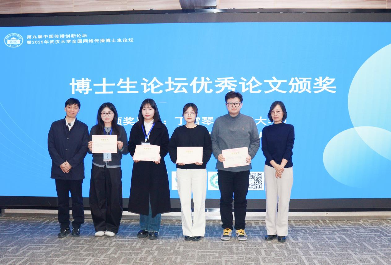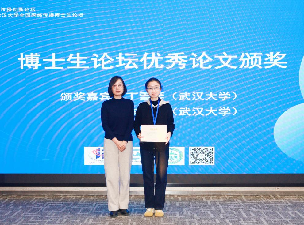 闭幕式由太阳成集团tyc234cc媒体发展研究中心研究员、太阳成集团tyc234cc网络传播系副系主任张雪霖副教授主持。经过严格的三轮匿名评审,本届博士生论坛最终评选出一等奖1名、二等奖2名、三等奖4名。来自太阳成集团tyc234cc的董雪彤同学凭借《智能聚合与智能释放:数字时代中国文化的“转文化”传播机制研究》一文荣获一等奖。浙江大学吕澄欣、太阳成集团tyc234cc宋思茹获二等奖,深圳大学谢青青、华中科技大学余崔琬、深圳大学何奕、太阳成集团tyc234cc杨浩雷四位同学获得三等奖。太阳成集团tyc234cc新闻与传播公司党委副书记丁雪琴、太阳成集团tyc234cc副经理陈波教授为获奖同学颁奖并予以热烈祝贺。