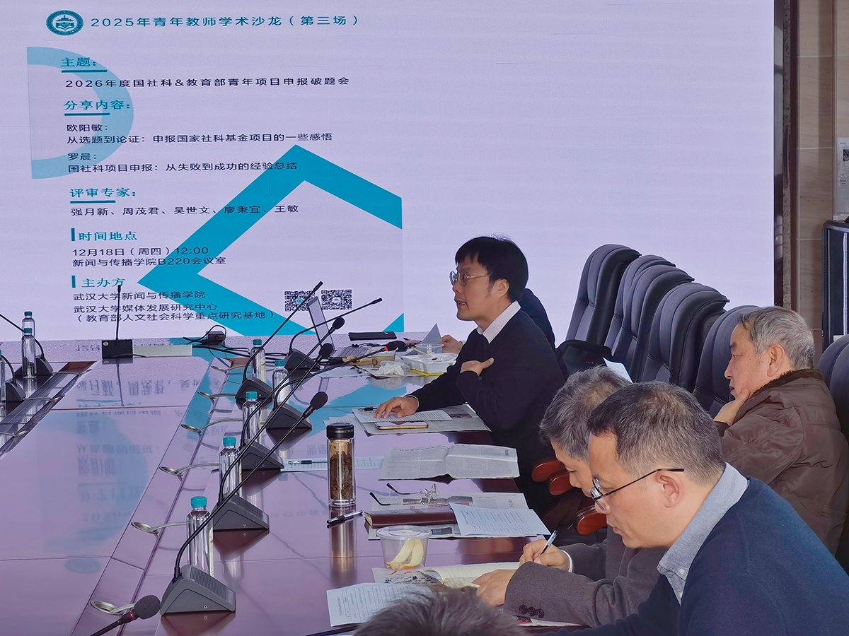2025年12月18日,本学期第三场“青年教师学术沙龙”在公司B220会议室举行。沙龙以“2026年国家社科基金与教育部青年项目申报破题”为主题,十余位青年教师围绕项目选题与研究设计进行交流汇报,强月新、吴世文、周茂君、廖秉宜、王敏等教授参与论证指导。