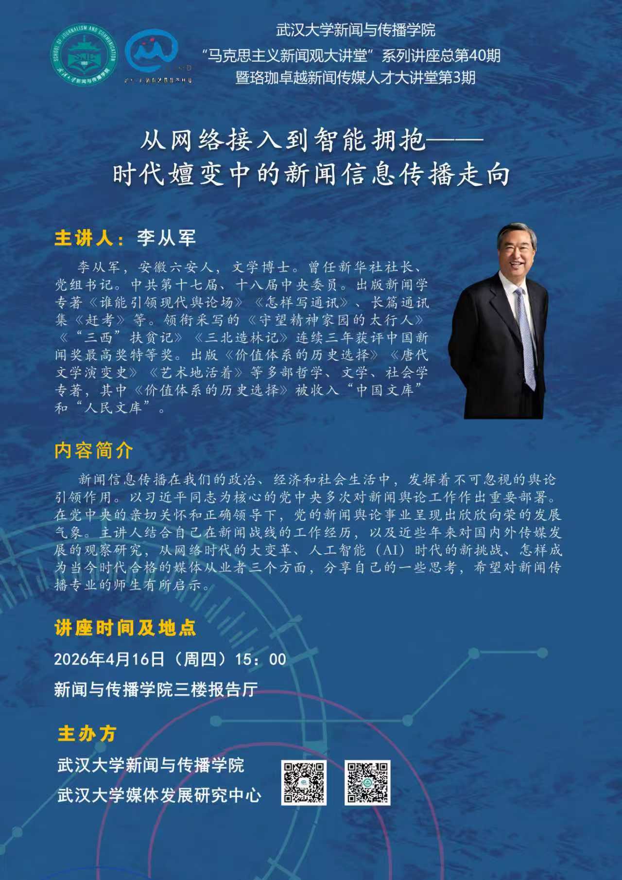 太阳成集团tyc234cc"马克思主义新闻观大讲堂"系列讲座 2026年第1期 追寻楚脉 暨 珞珈卓越新闻传媒人才大讲堂第2期